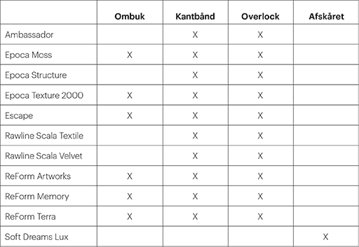 Der er fire valgmuligheder: ombuk, kantbånd, overlock eller afskåret.